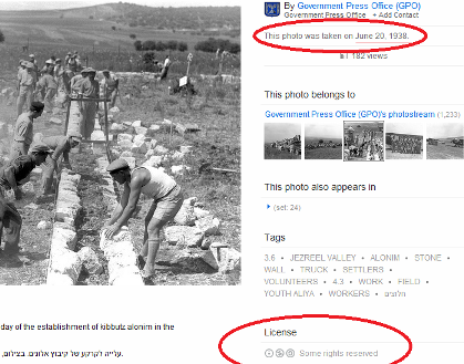 לדוגמה: בדף התמונה מיום העליה על הקרקע של קיבוץ אלונים בשנת 1938 (ראו את צילום המסך) – כתוב מימין, תחת הסעיף "רשיון", שחלק מהזכויות מוגבלות. אם מקישים על משפט זה, מגיעים לדף בו מובהר שבתמונה לא ניתן לעשות שימוש מסחרי. עם זאת, כך כתוב בדף, כאילו כדי לבלבל, במקרה בו התמונה חופשית לשימוש מתוקף חוק, תנאי הרשיון המצויינים לגביה אינם תקפים..